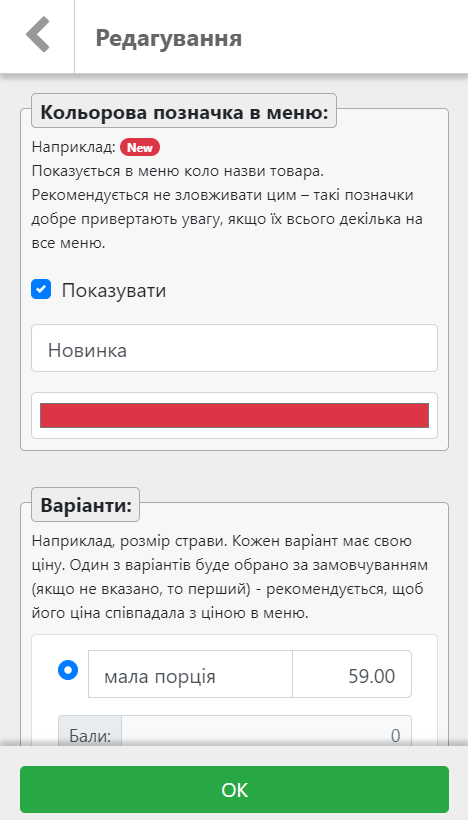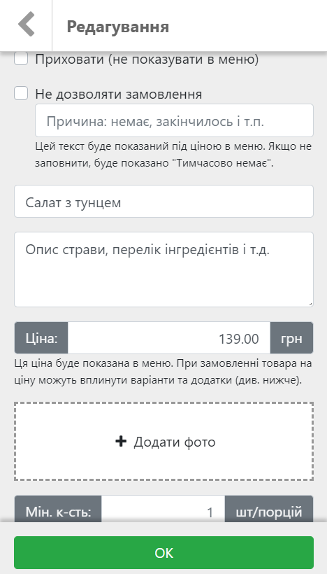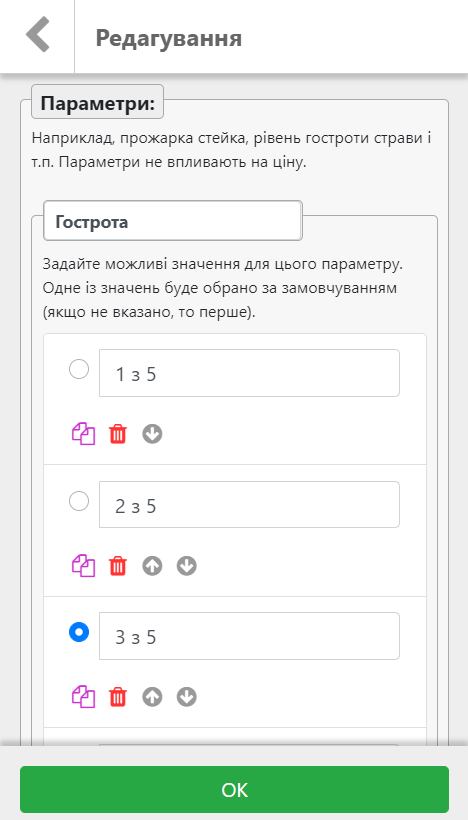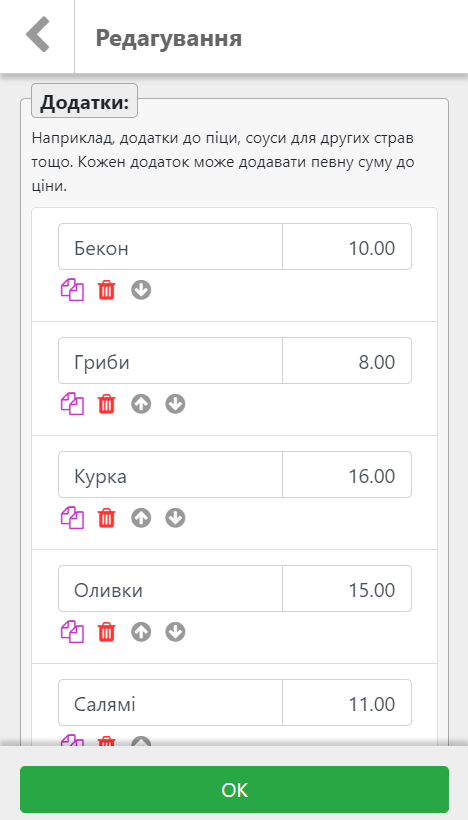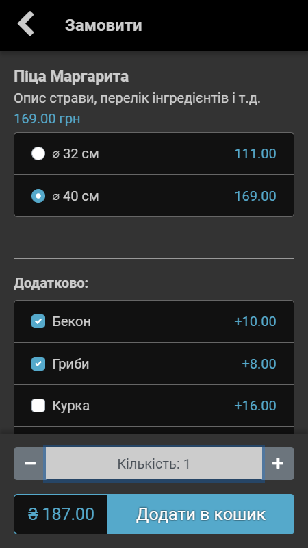 Кожна страва в меню крім назви, опису та ціни може мати ще набір додаткових опцій та параметрів:
