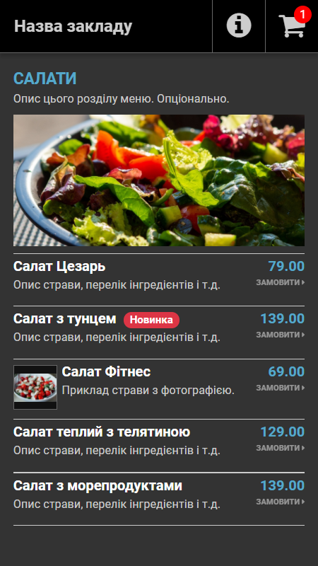Онлайн-меню може бути оформлене у фірмових кольорах закладу з використанням фірмових шрифтів.