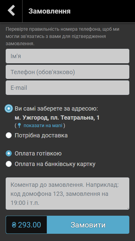 Система не вимагає від клієнта реєстрації, але запам'ятовує його контактну інформацію після першого замовлення, що дозволяє йому робити повторні замовлення буквально у декілька кліків.